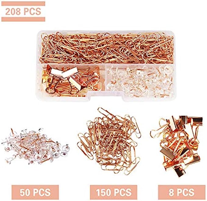 208 PCS Rose Gold Desk Accessory Push Pins Binder Clips Paper Clips Standard Size Office Supplies Kit Set with Storage Box(Small Pack)
