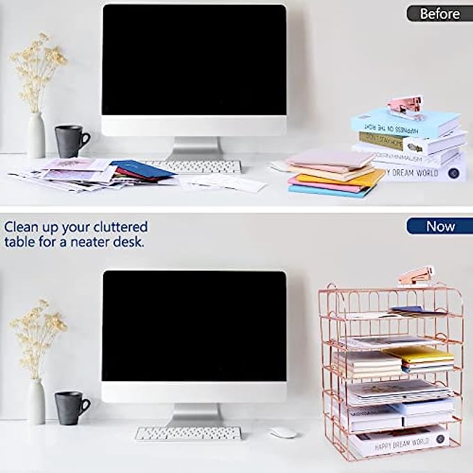 • 【6 Stackable Trays】-This rose gold desk organizer includes 6 file trays and one upper display shelf. Use this desk file organizer as individual trays or stack them to save more space. You can use them for one person or separate them for multiple people.