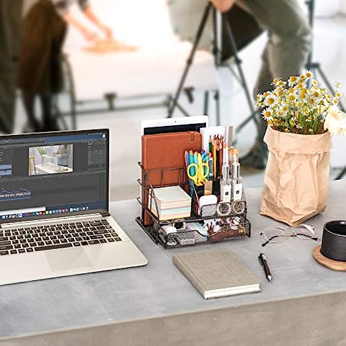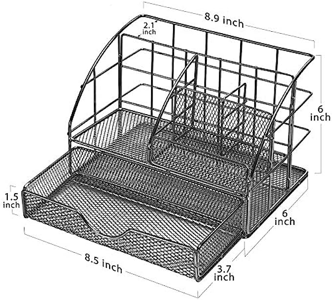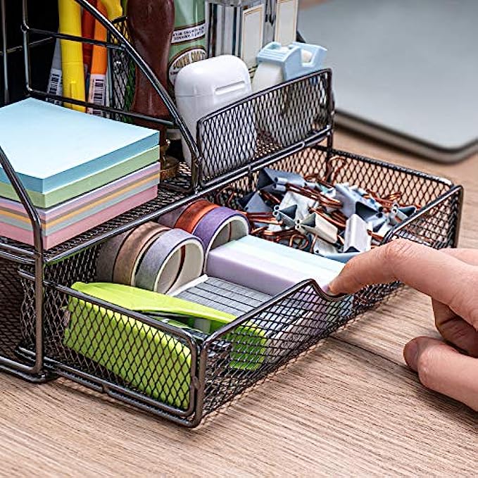 • EASY ACCESS: Mesh design allows you to easily find anything you need. Our desk organizer’s pull-out drawer slides in and out smoothly and effortlessly upon tug. The office desk organizer comes fully assembled; just unbox and go. Having a tidy desk makes you work twice as fast and helps you become more creative throughout the day!