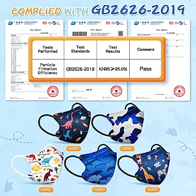 • MULTICOLOR PATTERNS - 50 pcs kids masks disposable kn95 per box, dinosaur, camo, animal, shark, ocean world, different colors and patterns to meet your kids’ daily needs, great for children 4-12 years old for school, kindergarten