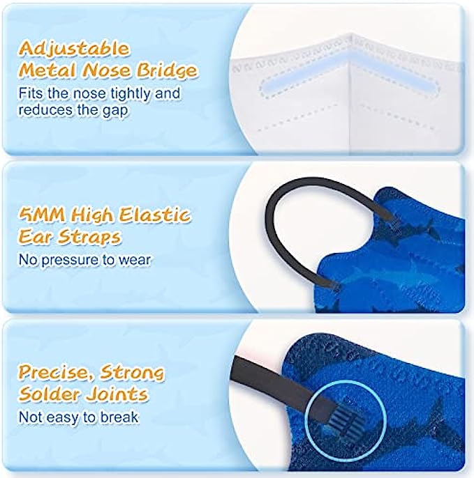• COMFORTABLE & BREATHABLE - The 5MM widened ear loops are more comfortable to wear, the adjustable nose bridge strips tightly fit the nose, making the kn95 kids face mask not easy to fall off