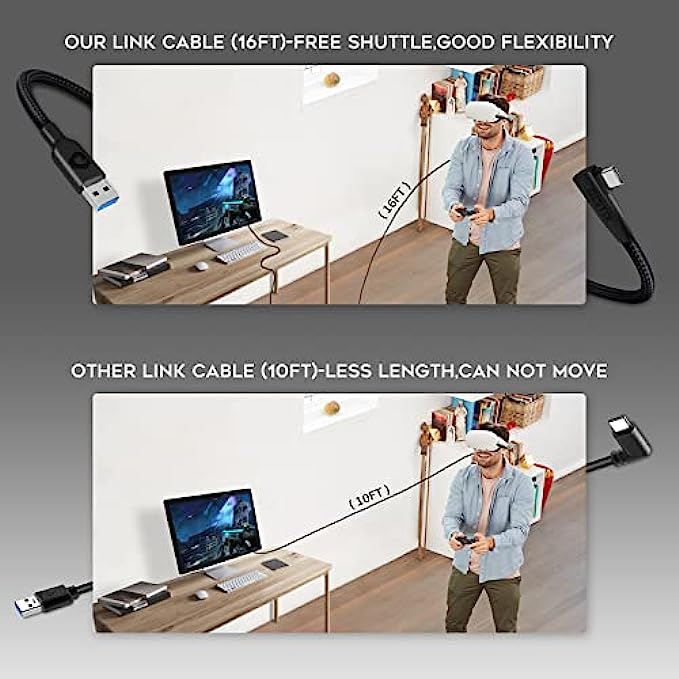 • 【16FT Extended Length and 90-Degree Right Angle Design】16ft link cable long enough in the room, allow you to move freely without restriction when playing games. Featuring a 90° right angle prevents disconnection and is more stable, giving you an immersive VR gaming experience.