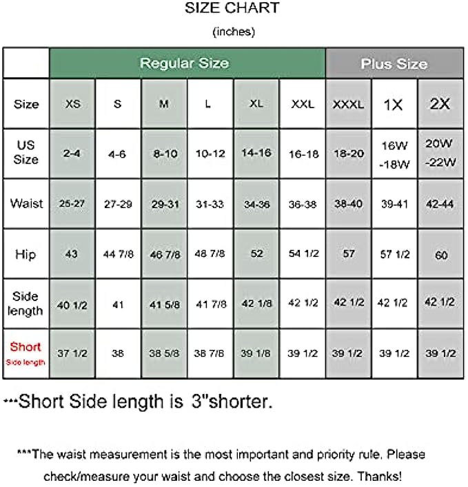 • 【Waist】SIZE XS NATURAL WAIST=26 3/8",SIZE S NATURAL WAIST=28 1/3", SIZE M NATURAL WAIST=30 1/3",SIZE L NATURAL WAIST=32 1/3",SIZE XL NATURAL WAIST=34 1/4",SIZE  XXL NATURAL WAIST=36 1/4" SIZE XXXL(1X) NATURAL WAIST=39"SIZE 2X NATURAL WAIST=43" INSEAM LENGTH 27 1/2”  OUTLENGTH 40 1/2"--42 1/2”Please measure your natural waist @bellybutton and CHOOSE THE CLOSEST SIZE.Only Size 1X and 2X are Plus sizes.