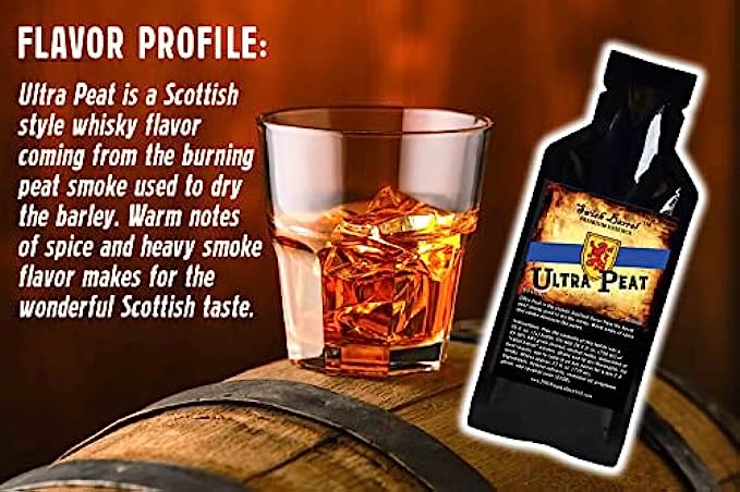 • Ultra Peat is a Scottish style whisky flavor coming from the burning peat smoke used to dry the barley. Warm notes of spice and heavy smoke flavor makes for the wonderful Scottish taste. The flavor expands and oak notes are imparted when aged in a small or mini oak barrel.
