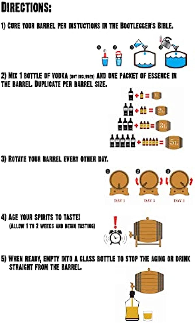 • Check out our other essence flavors from our spirit making Bootleg Kits; Kentucky Bourbon, Small Batch Bourbon, American Rye Whiskey, Blended Whisky, Canadian Rye Whiskey, Pot Sill Whisky, Absinthe, Port, Wine, Orange Brandy, Texas Corn Whiskey, Barley Whisky and many more…