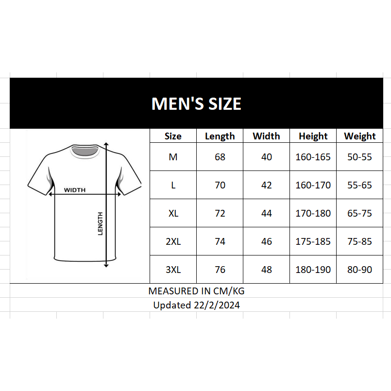 Fast delivery. Bought the size base on the chart given. Fit me base on height. However is best to measure and determine what size to suit individual needs. Material is light and quick dry which is very suitable for our weather here.