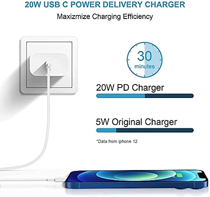 • 【Romitaz PD 3.0 Fast Charger for iPhone】 iPhone Fast Charger equipped with 20W PD 3.0 USB Type C power delivery wall plug, PD 3.0 Quick-Charge USB C port provides Max 20W output power, charge your device up to 3x faster than original 5W charger,charging your iPhone 12 up to 50% in just 30 minutes, saving over 1.5hrs for you.