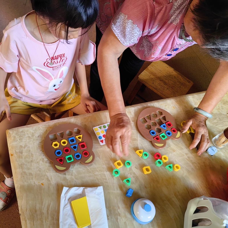 A good activity for elderly too. Helps in cognitive thinking skills. To follow pattern on cards to match the same colour and shape in the correct column and row.